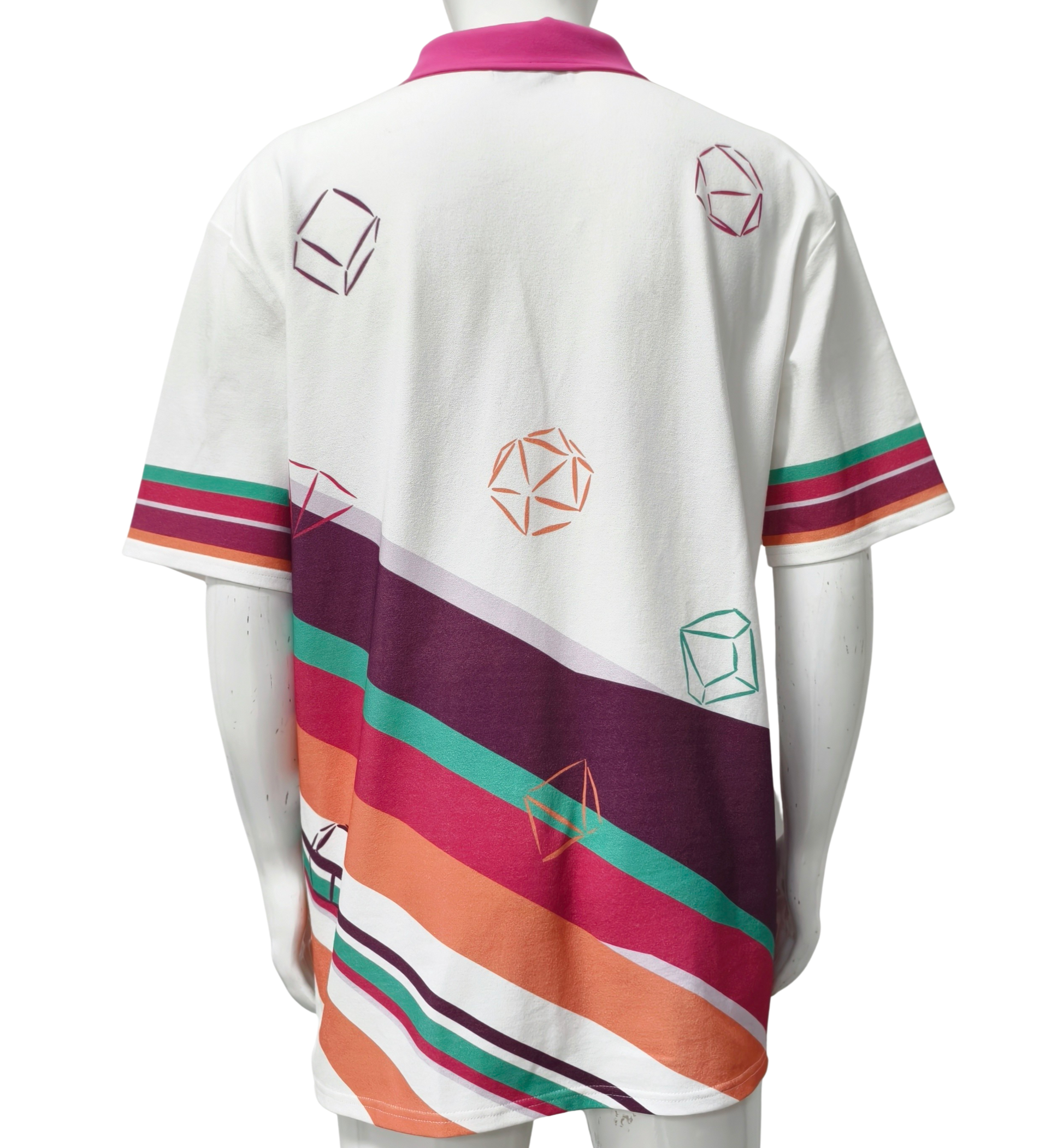 Bold 90s palette – plum, teal, magenta, and sunset orange slash across the torso and sleeves in true “paper cup jazz” fashion.