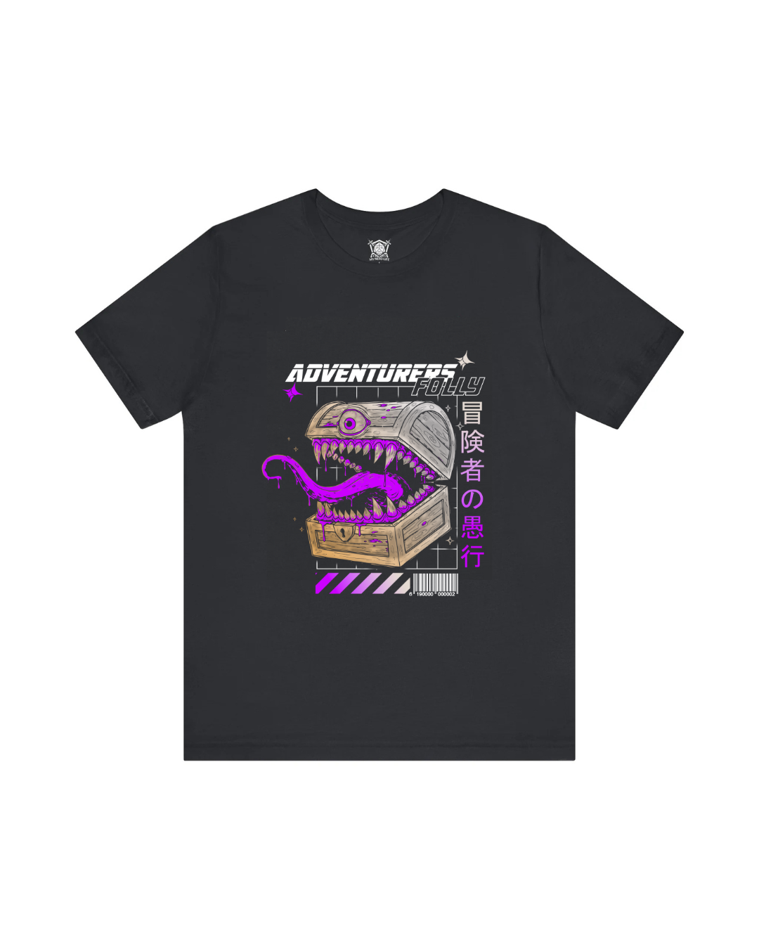 Get ready to unlock some retro chaos with the Adventures Folly Retrowave Tee! This design features a mischievous mimic treasure chest, complete with a hungry mouth and gleaming, playful eyes, ready to trick any adventurer who dares to get too close.