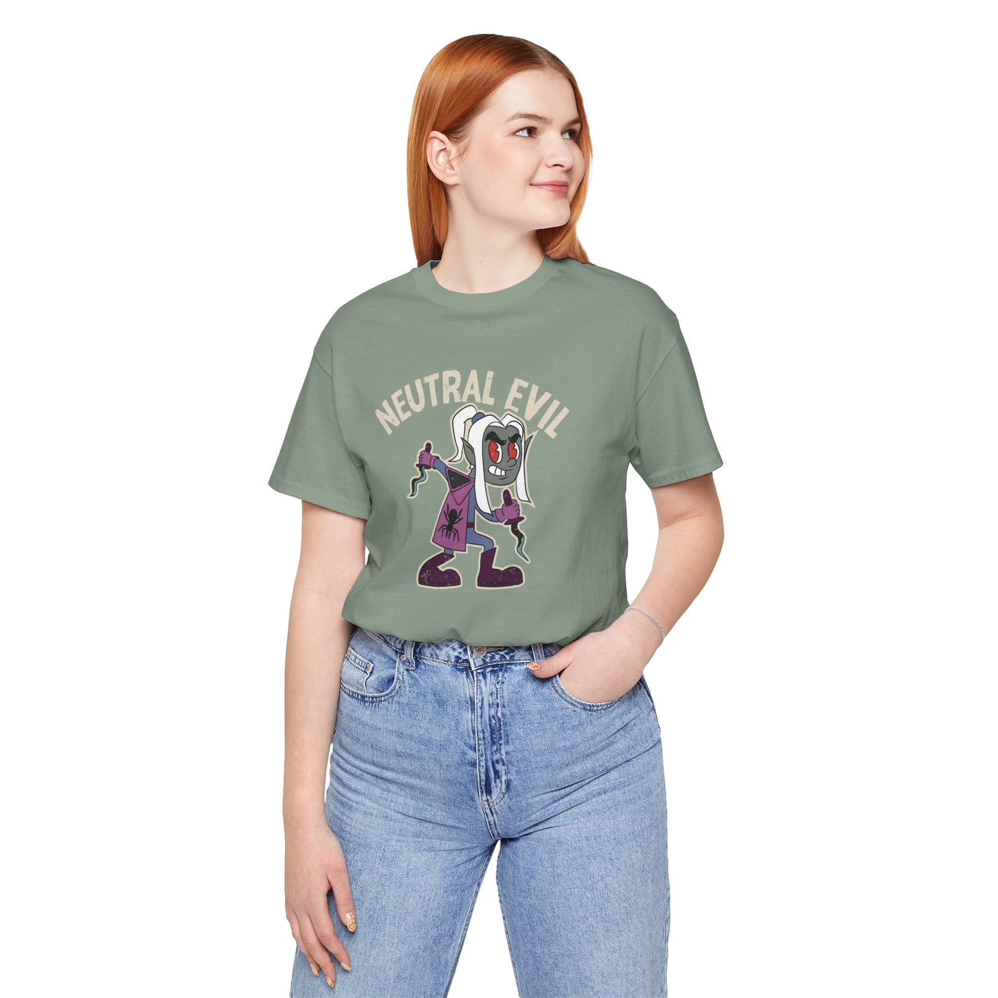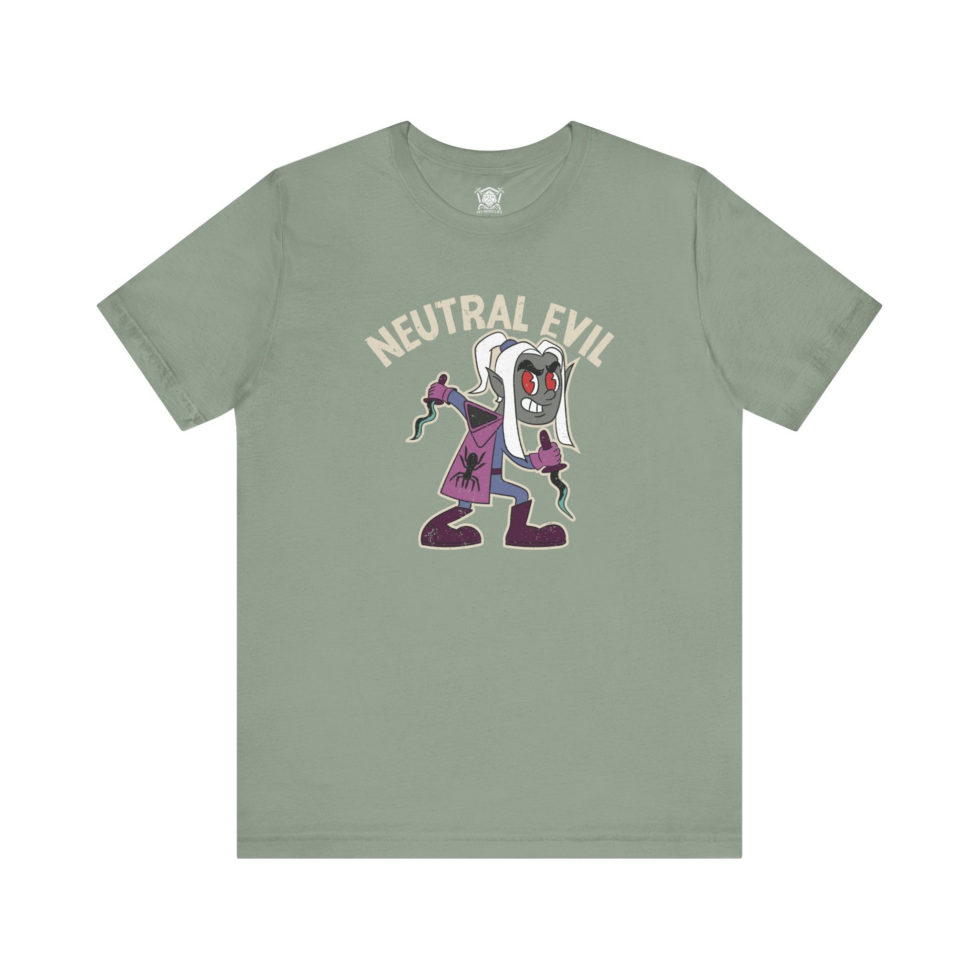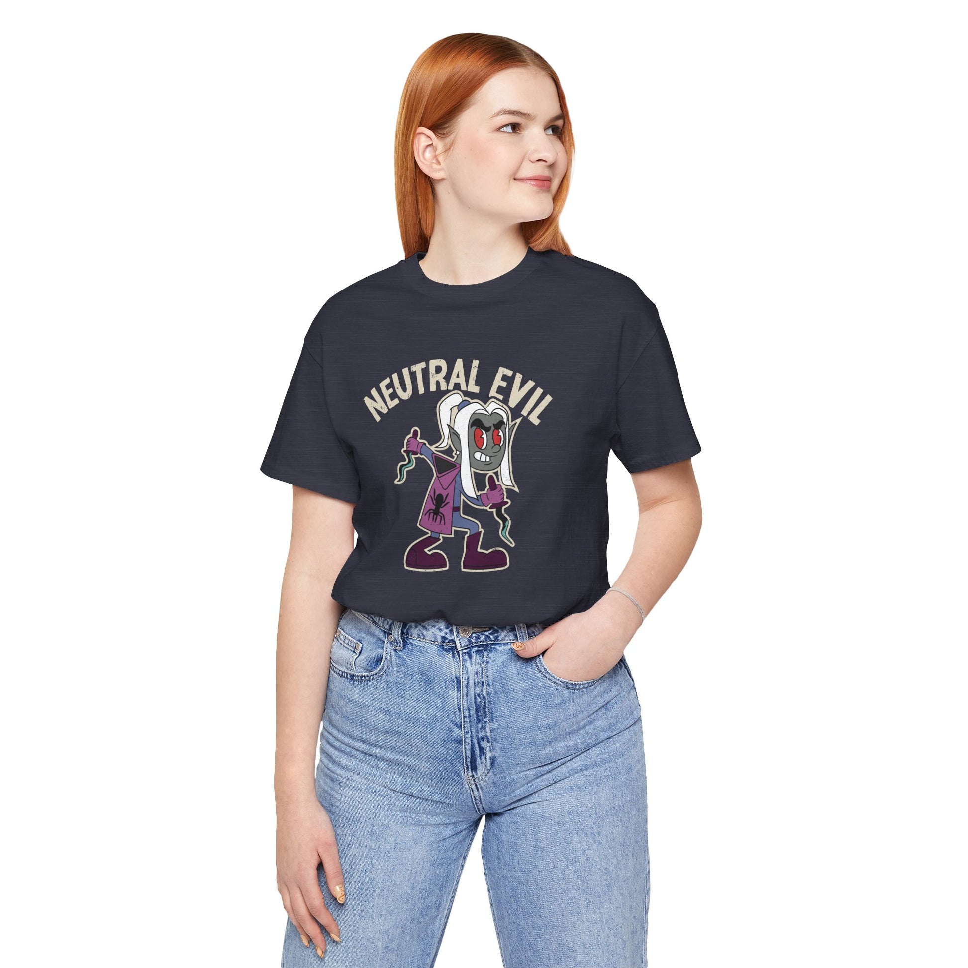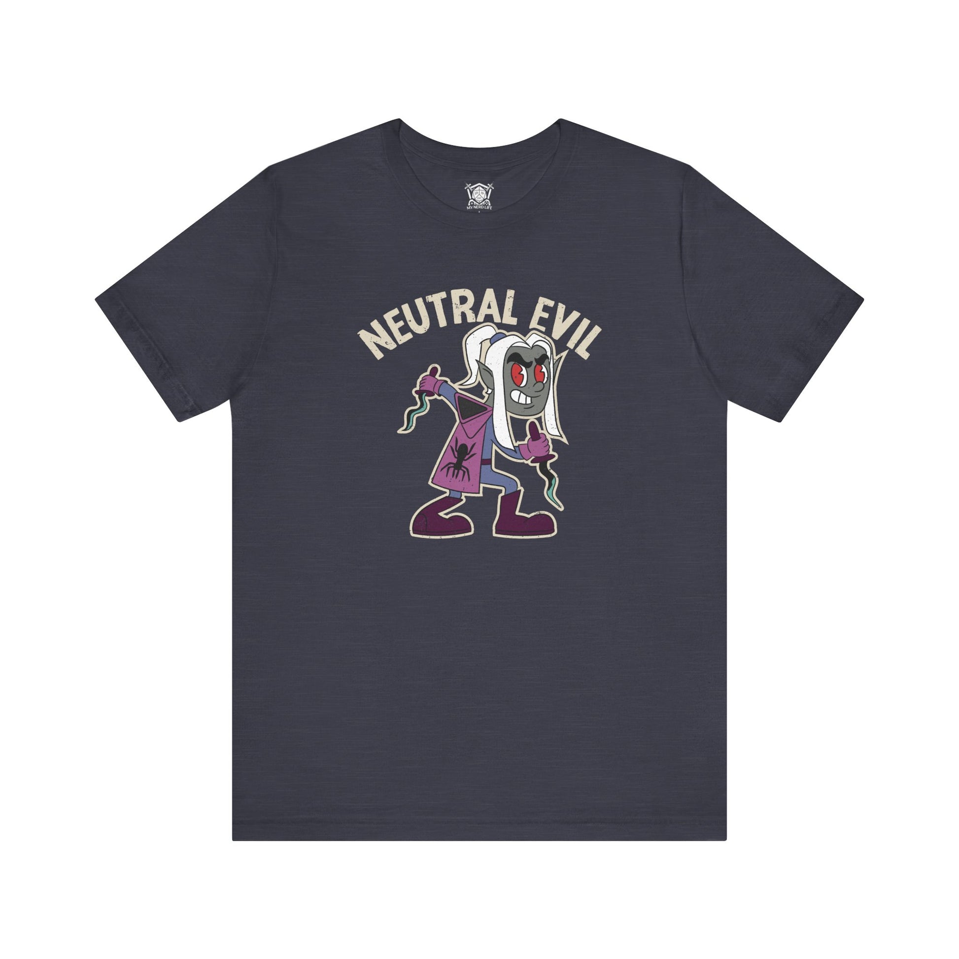 Embrace the shadows with this Neutral Evil Drow Tee.