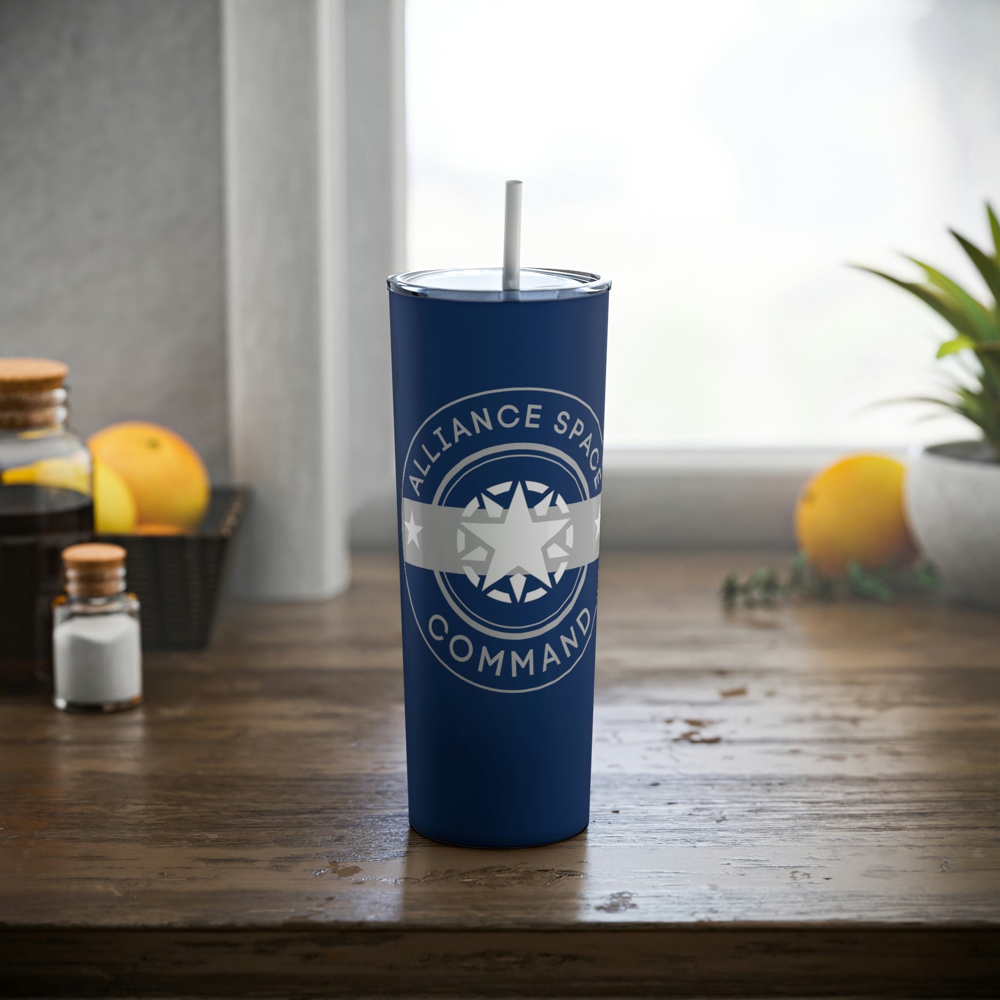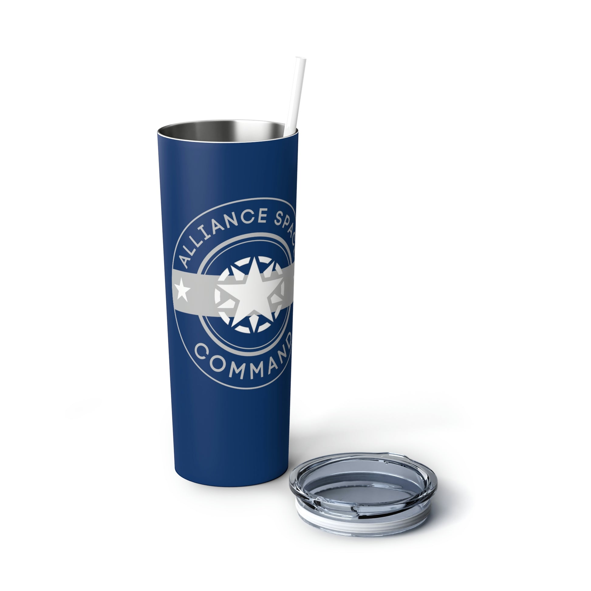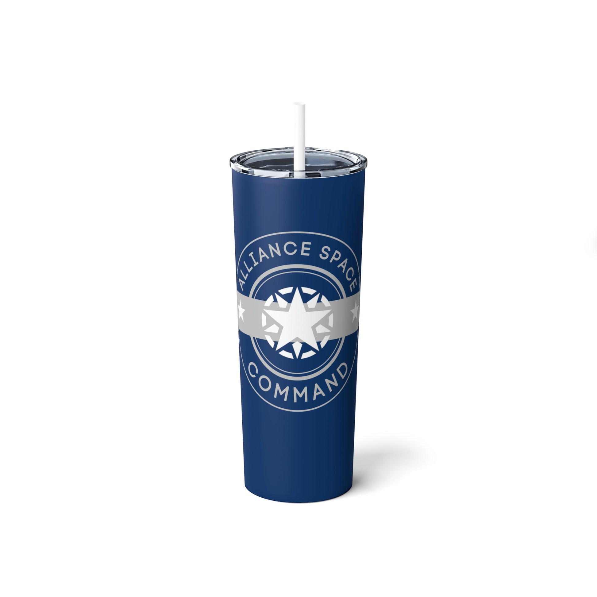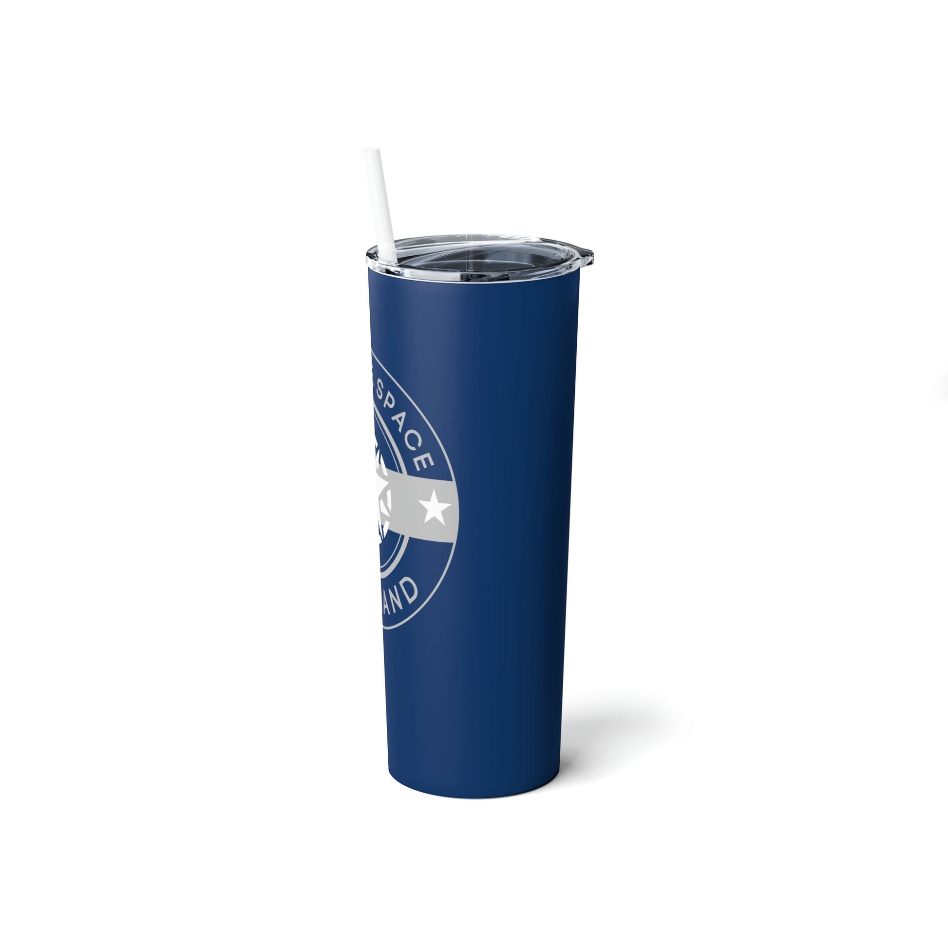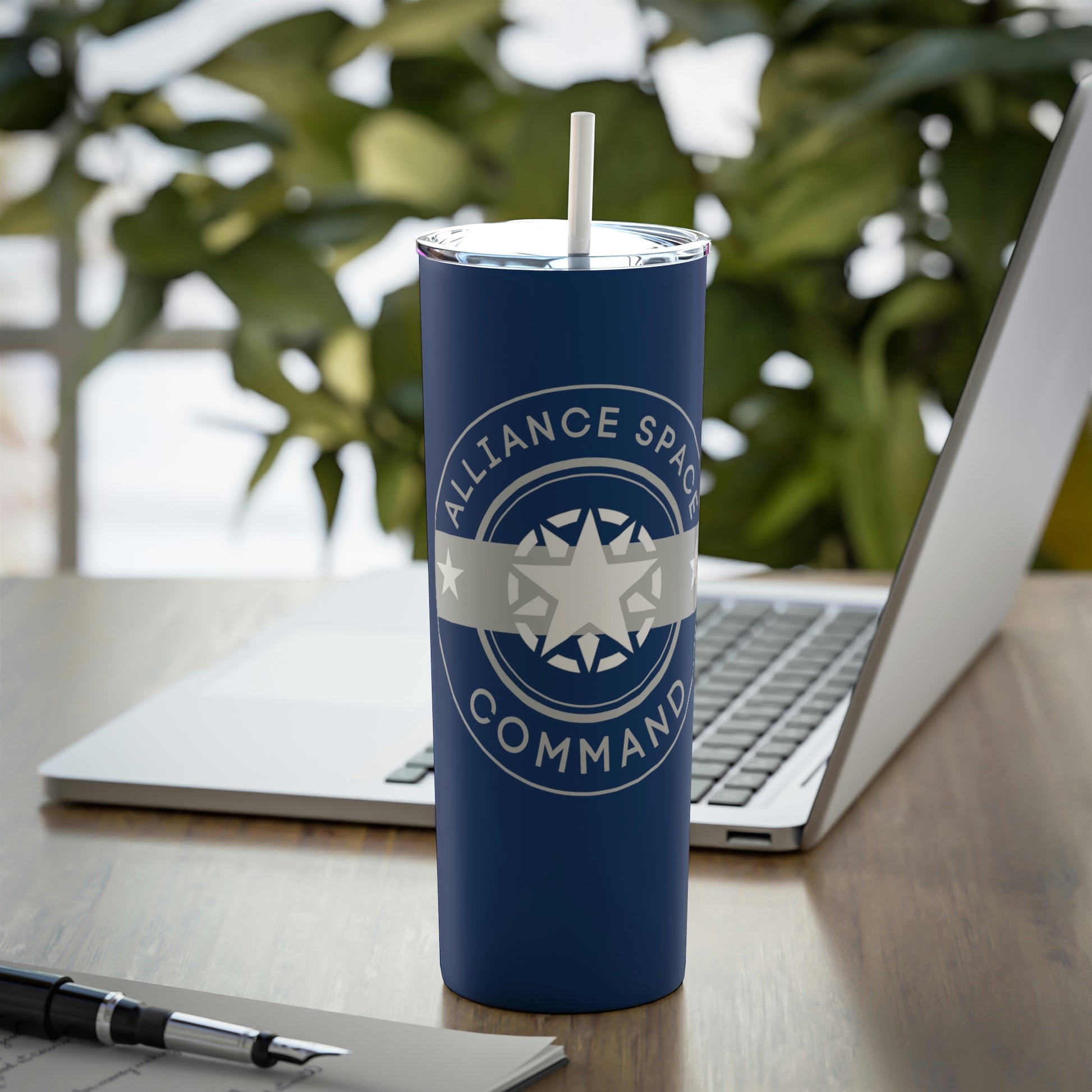 This skinny tumbler can hold 20oz of liquid and follow along on any space travels. Its plastic lid prevents spills while the included straw makes sipping on the go a blissful affair.