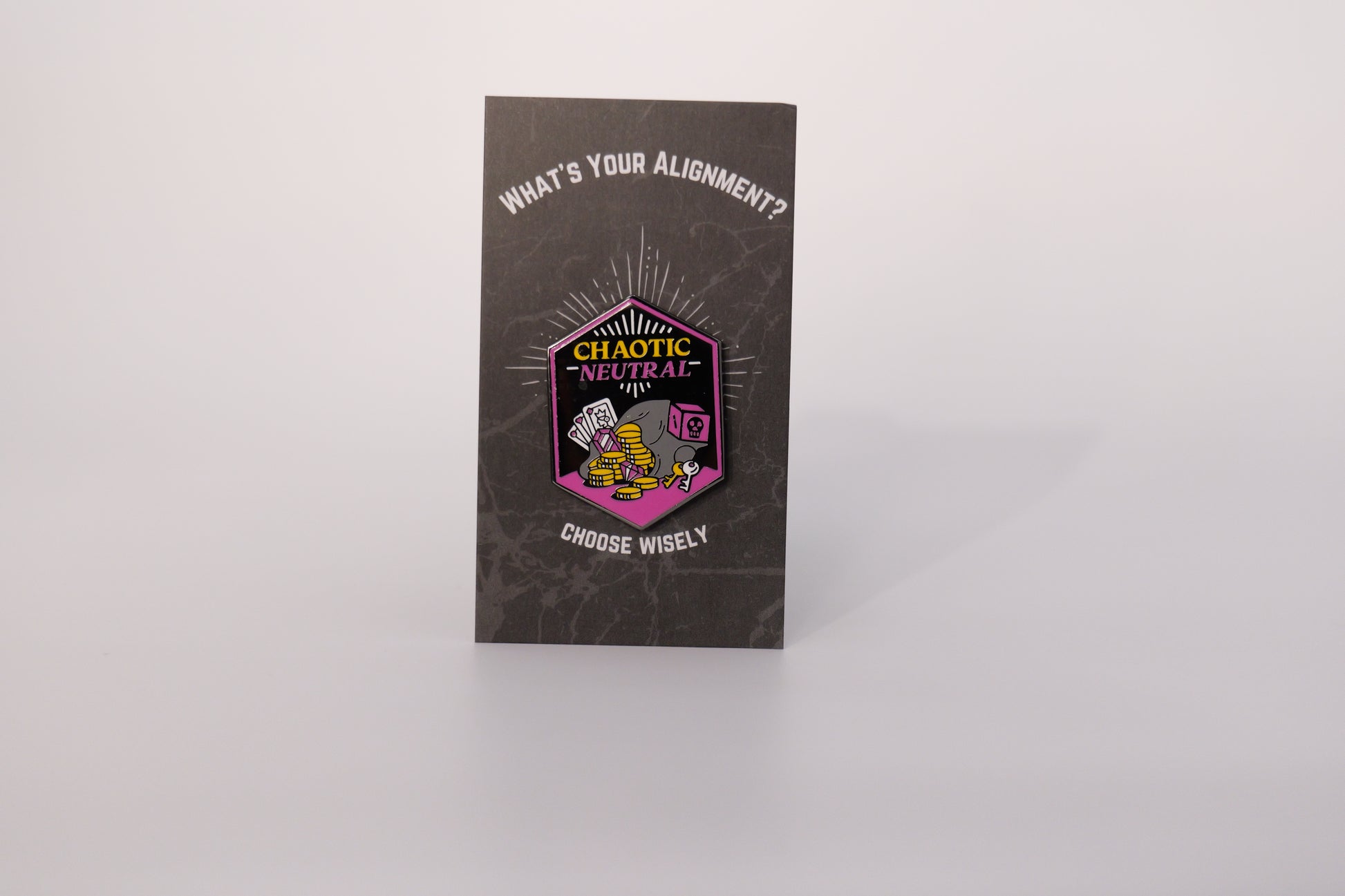 Embrace spontaneity with the Chaotic Neutral Hard Enamel Pin.