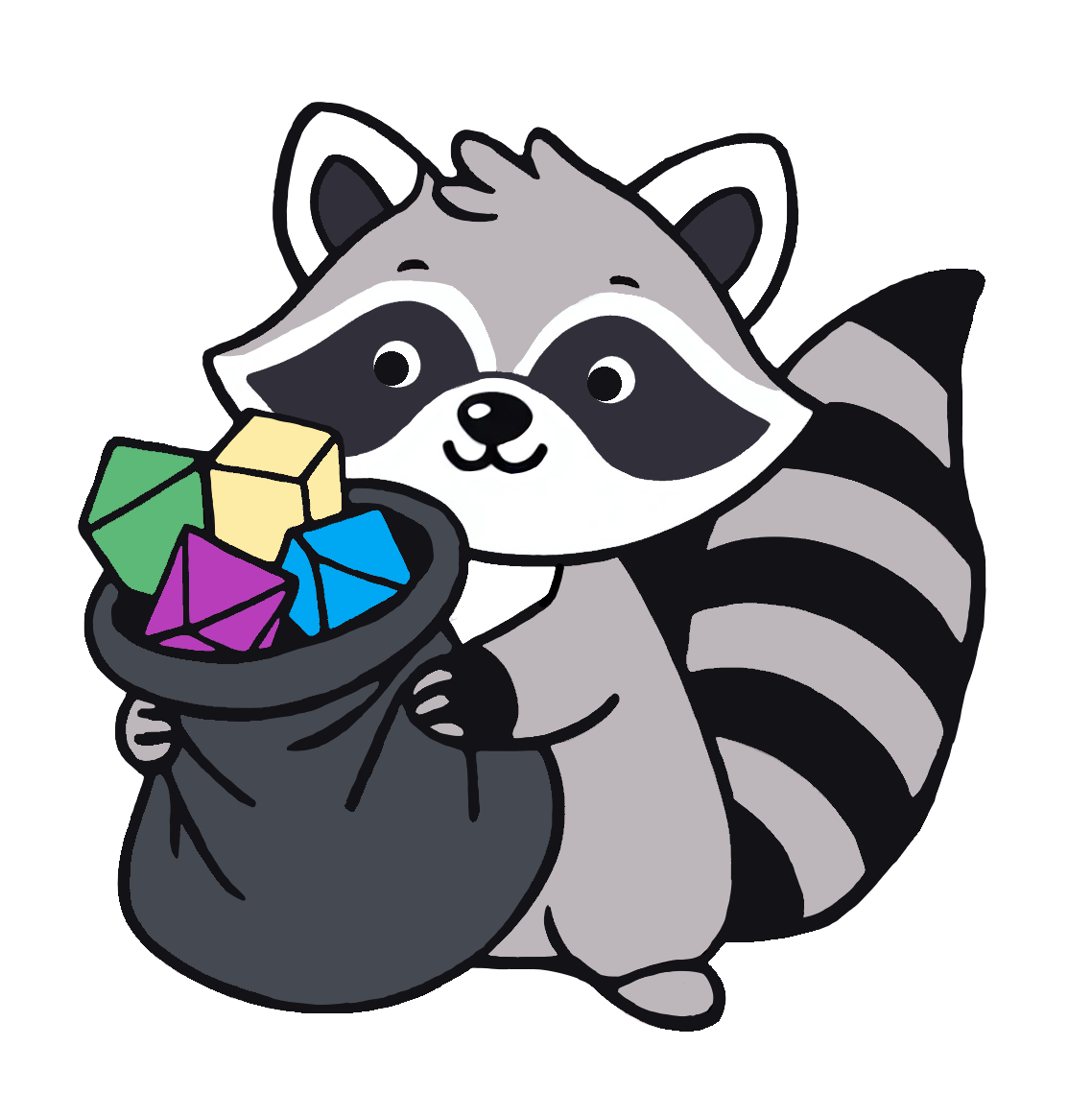 Meet Rollo the Raccoon—the sneaky star of our new pin drop and certified dice thief!