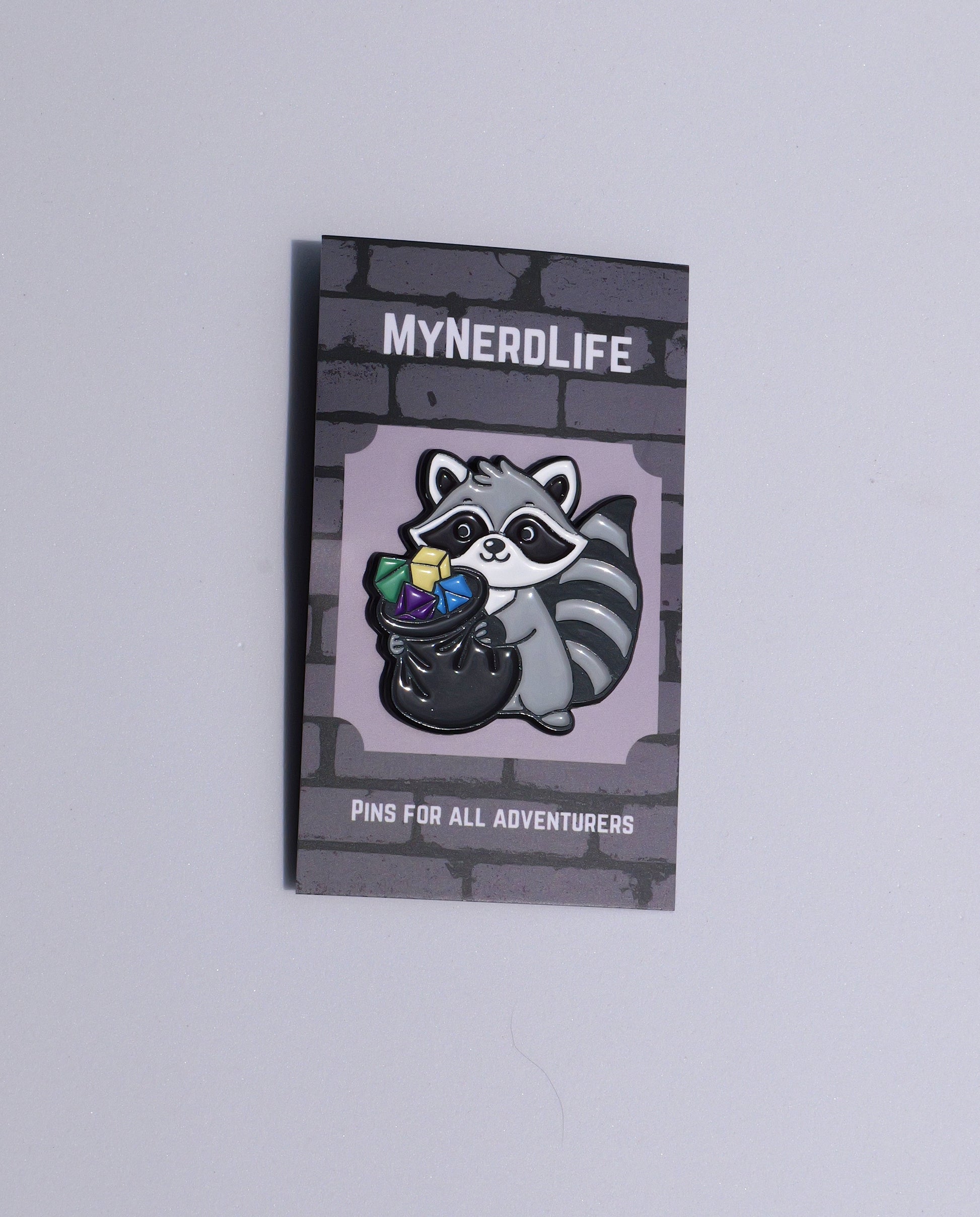 Crafted with high-quality soft enamel for a smooth, eye-catching finish, Rollo the Raccoon is ready to sneak onto your jacket, bag, or lanyard. Just keep an eye on your d20s—you’ve been warned.