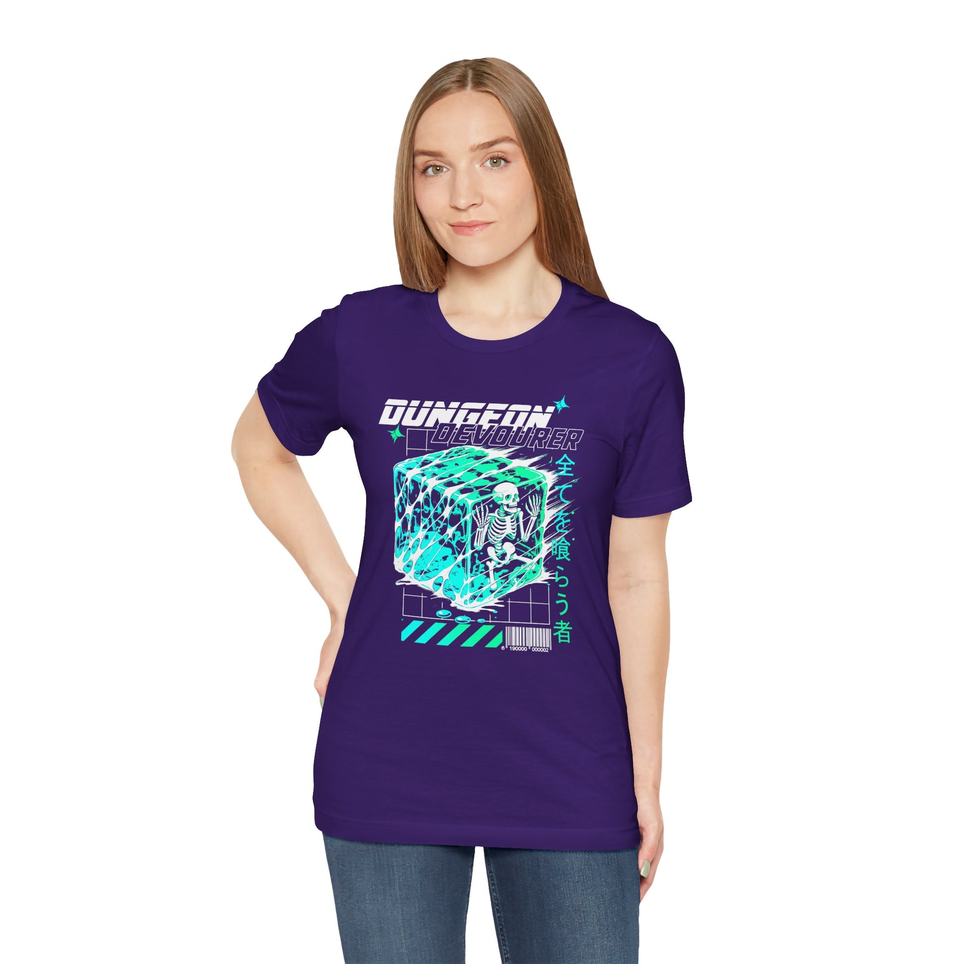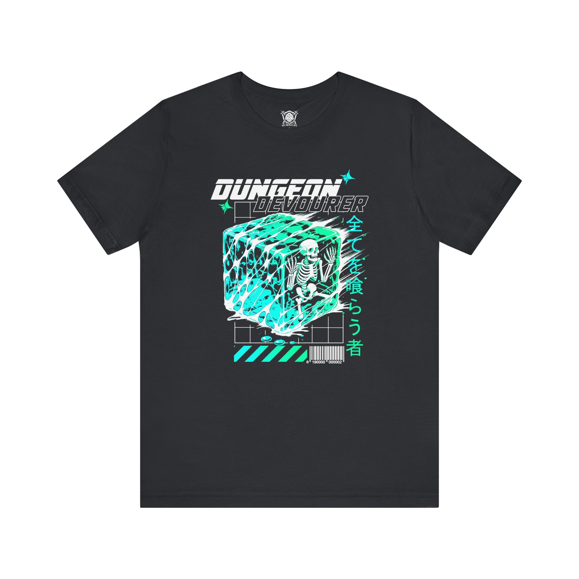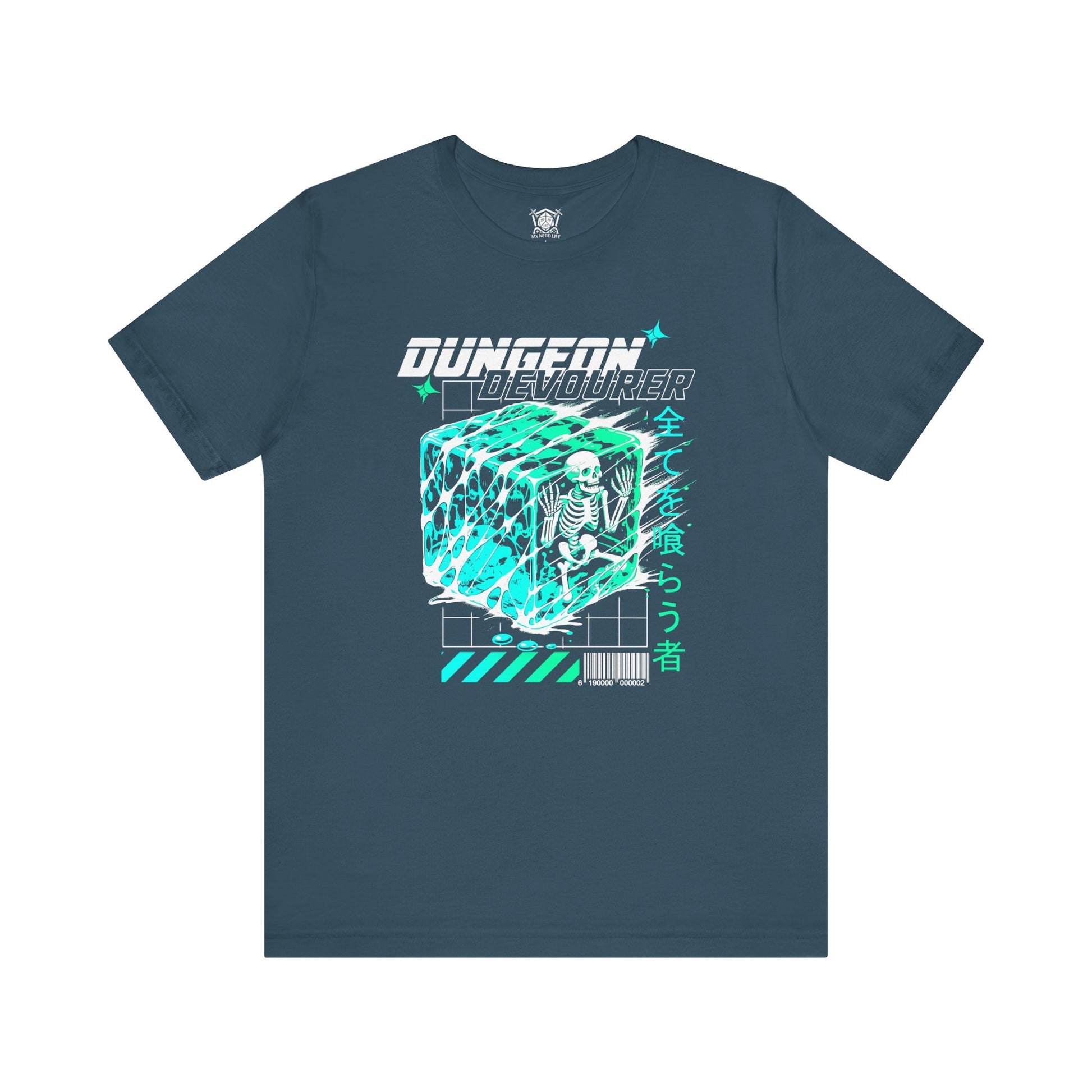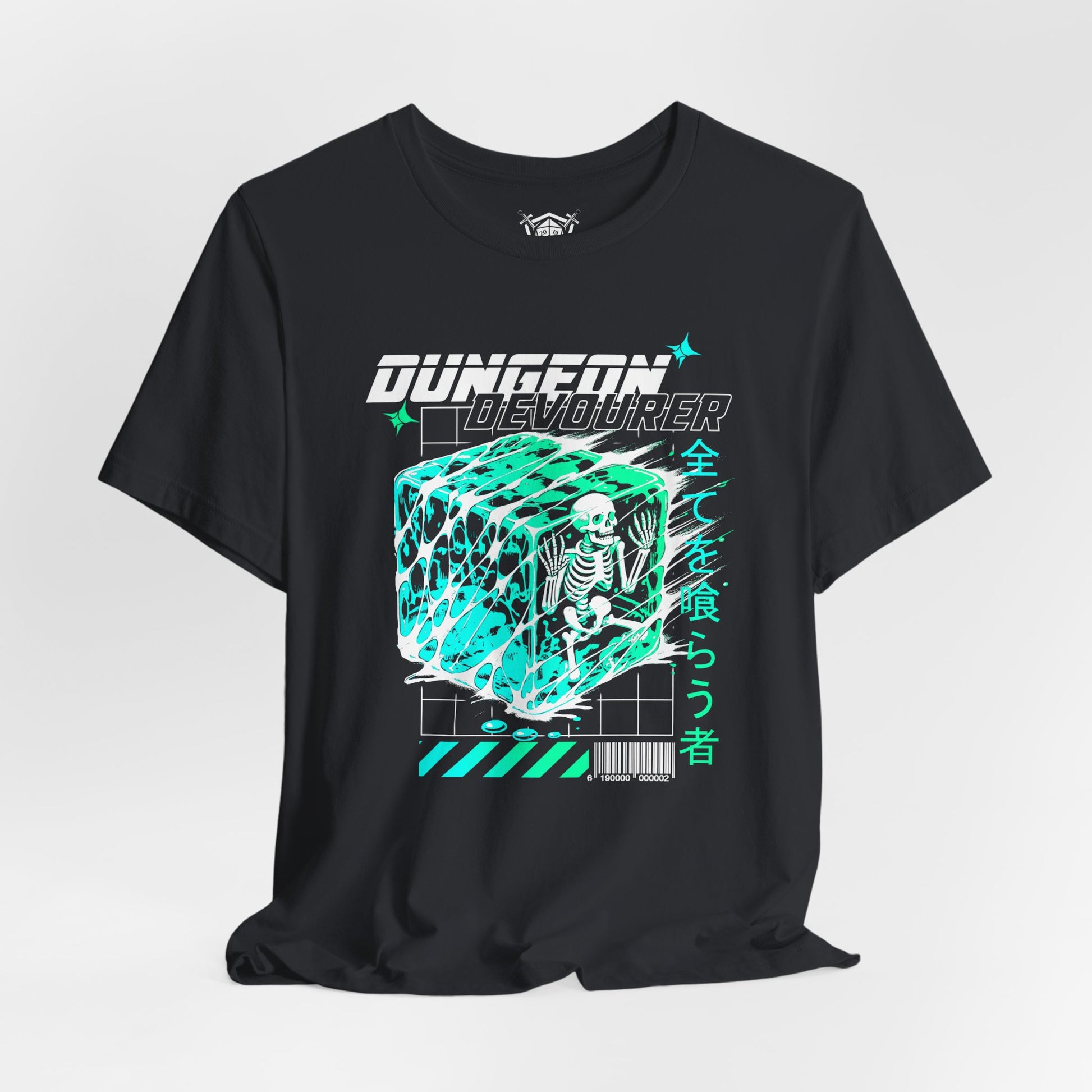 Dive into the depths of dungeon-crawling chaos with the "Dungeon Devourer" tee! Featuring a retro-inspired gelatinous cube engulfing an unfortunate adventurer, this design fuses cyberpunk aesthetics with tabletop RPG nostalgia.