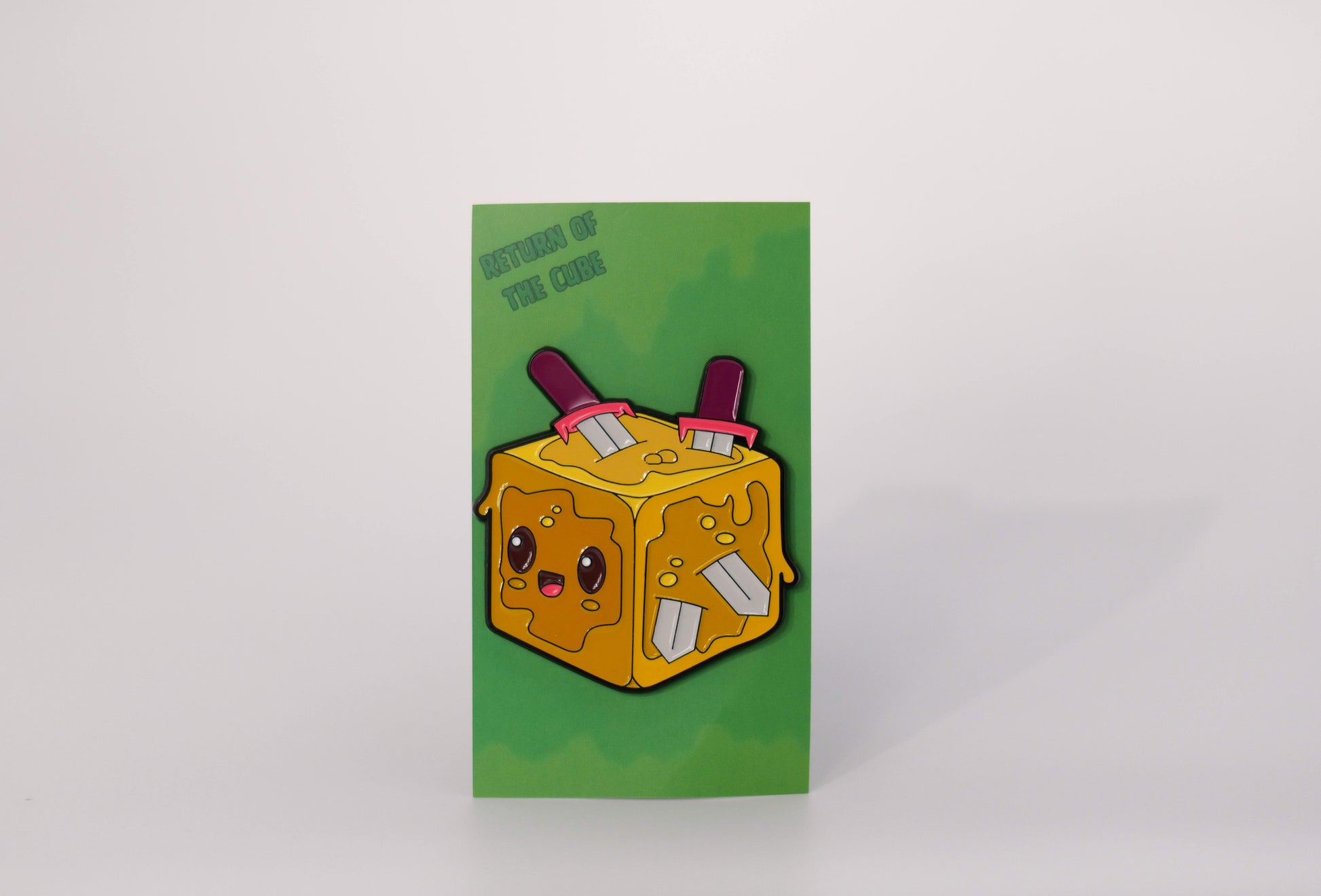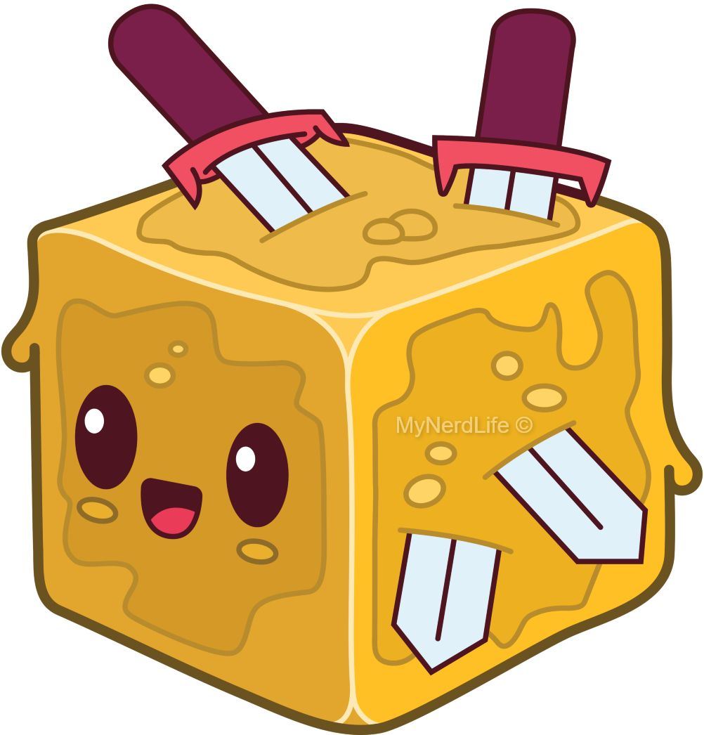 This delightful 2-inch pin features a golden honey-colored gelatinous cube with two swords sticking out, giving it a charming yet adventurous look. Its cheerful expression and unique design make it a standout piece that's sure to attract attention.