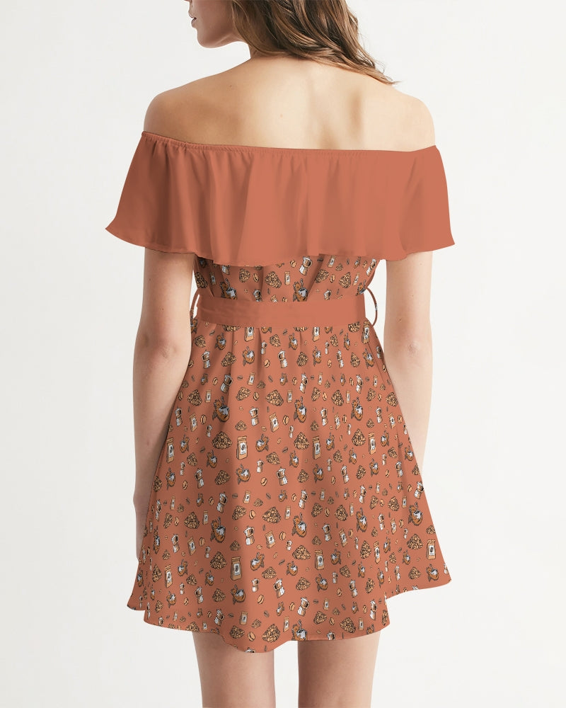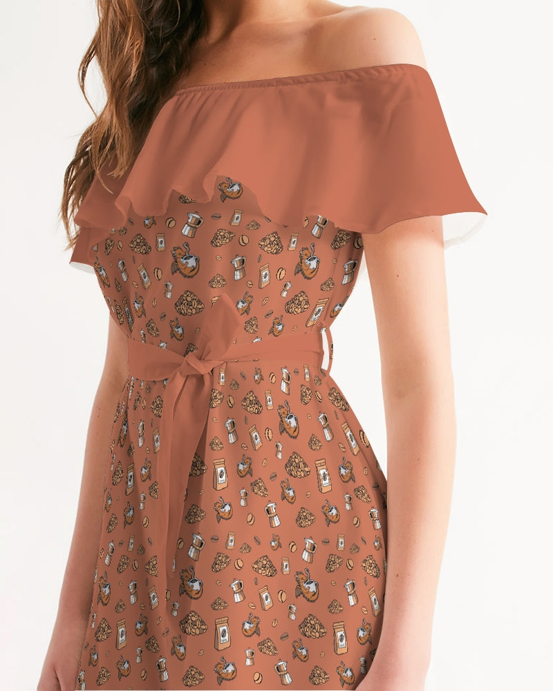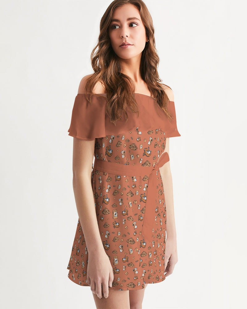 Step into a world of whimsy and warmth with the Java Joy - Off Shoulder Dress!This delightful dress features a playful pattern of adorable coffee-drinking dragons and aromatic coffee beans, making it a must-have for coffee lovers and fantasy enthusiasts alike. The off-shoulder design adds a touch of flirtatious elegance, while the soft, breathable fabric ensures you stay comfortable all day long. Whether you're meeting friends for brunch or enjoying a cozy day at the café, this dress is your perfect companion. Embrace the enchantment of your favorite brew and let your style soar with Java Joy! Product Details