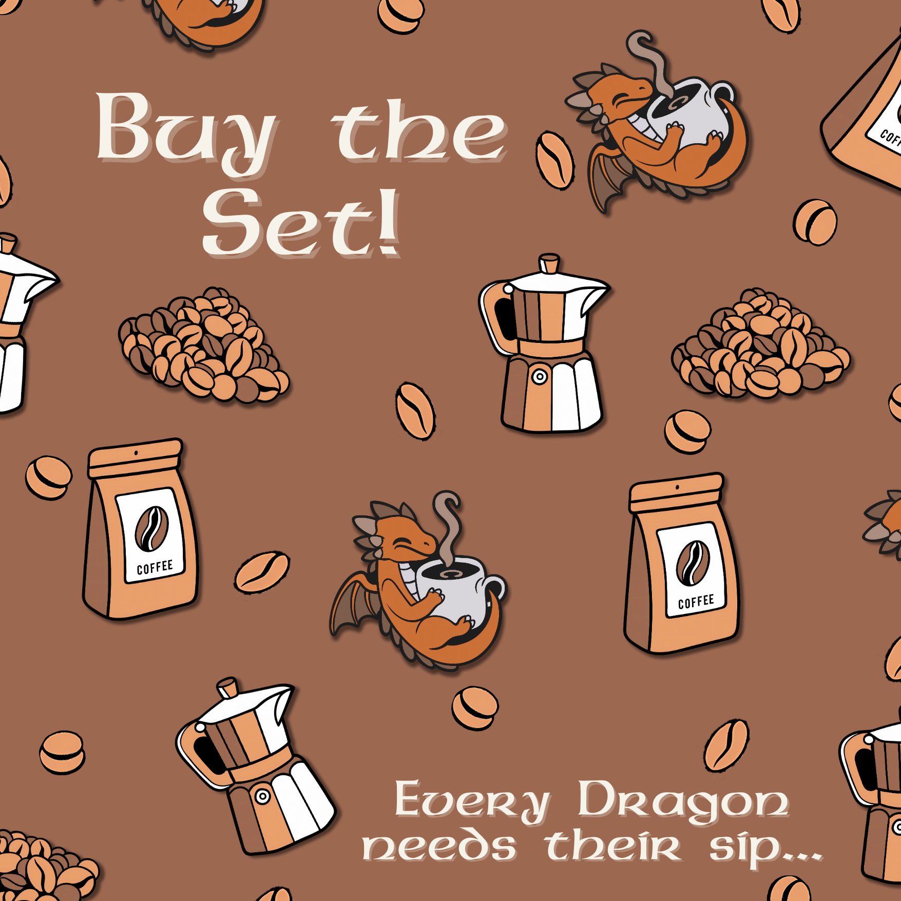 Add a touch of mythical energy to your collection with our Kaldi Pin Set. This finely crafted collection features Kaldi, our beloved caffeinated dragon, a Moka pot, Bag o' Beans, and Coffee Beans each in vibrant enamel.