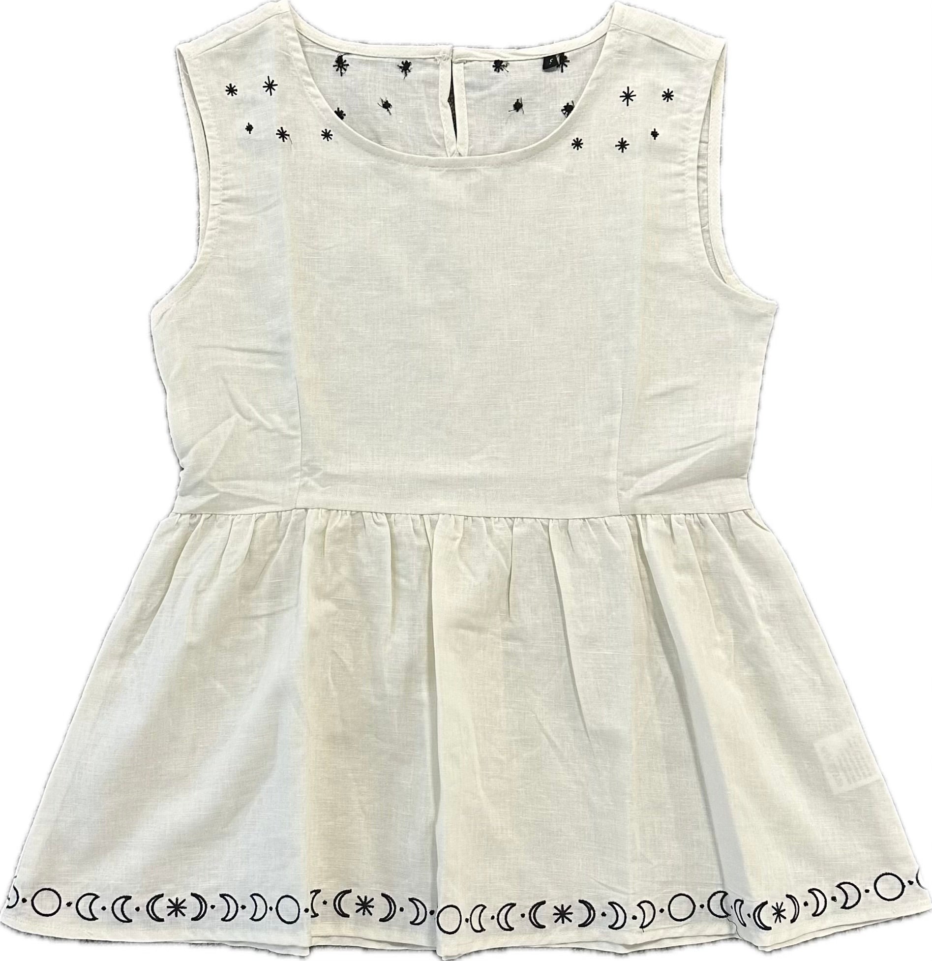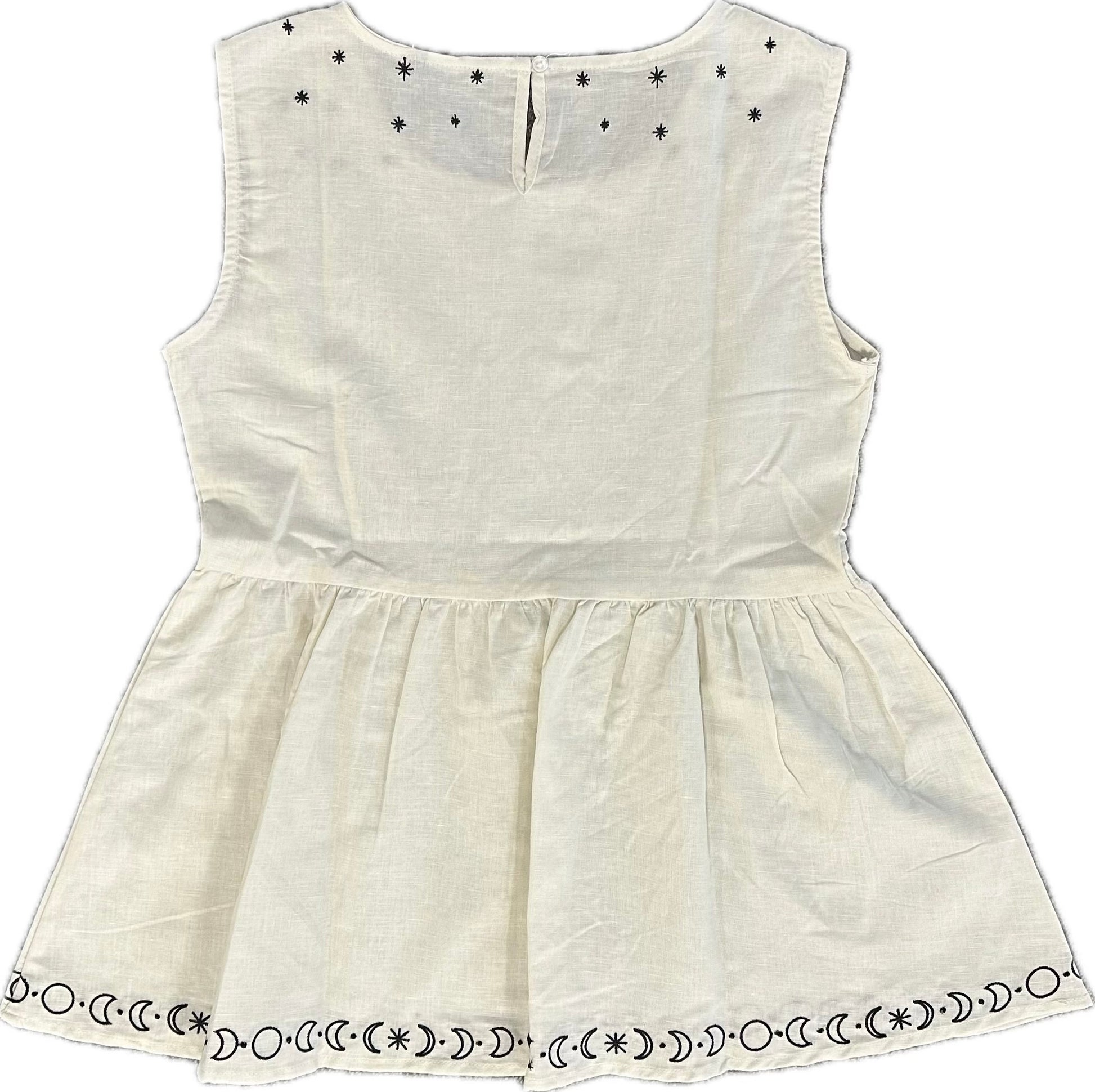 This airy, elegant top features delicately edge-embroidered moons and stars, giving it a celestial, hand-crafted feel. A squared neckline pairs beautifully with a cinched waist, creating a flattering silhouette that’s perfect for day-to-night styling. Lightweight linen keeps you comfortable while letting the embroidery shine, making it ideal for everything from casual brunches to evening stargazing.