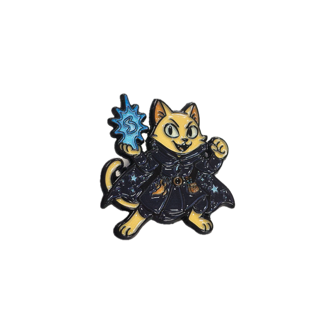 Unleash feline fury with our Tabaxi Warlock Enamel Pin - a magical mischief-maker cloaked in shadows and lit by blue flame. With his enchanted paw raised and his sleek black cloak billowing, this spell-slinging cat is ready to charm, curse, or crit-depending on his mood.